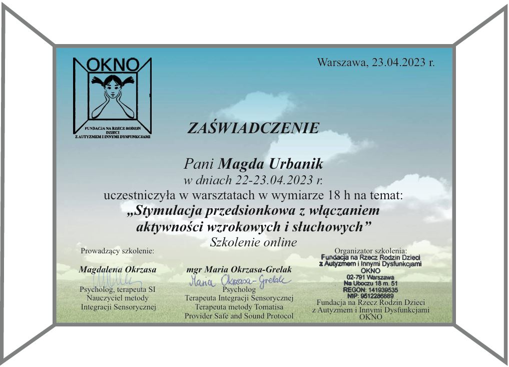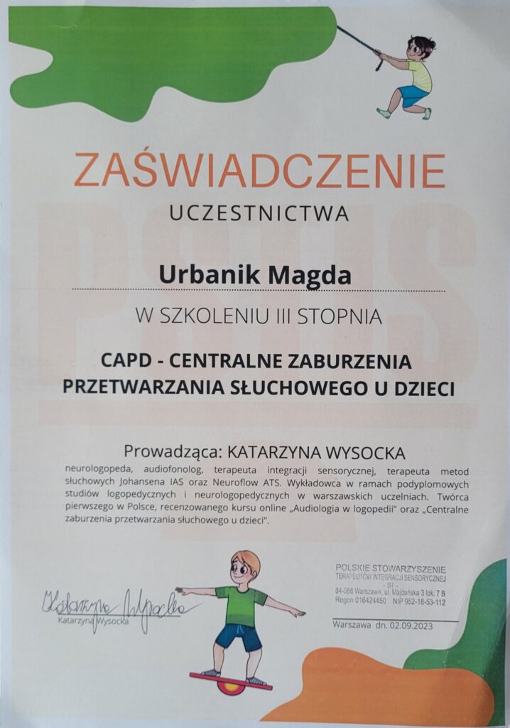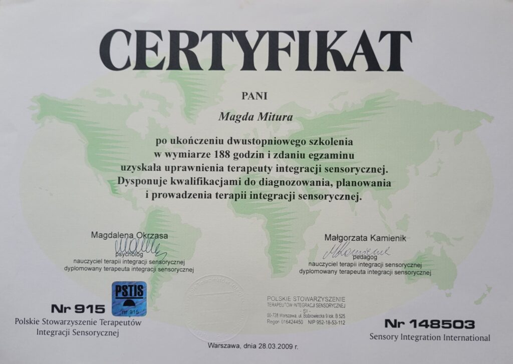 - dwustopniowe szkolenie i uzyskałam uprawnienia terapeuty integracji sensorycznej (PSTIS, Nr.915), 2009r.