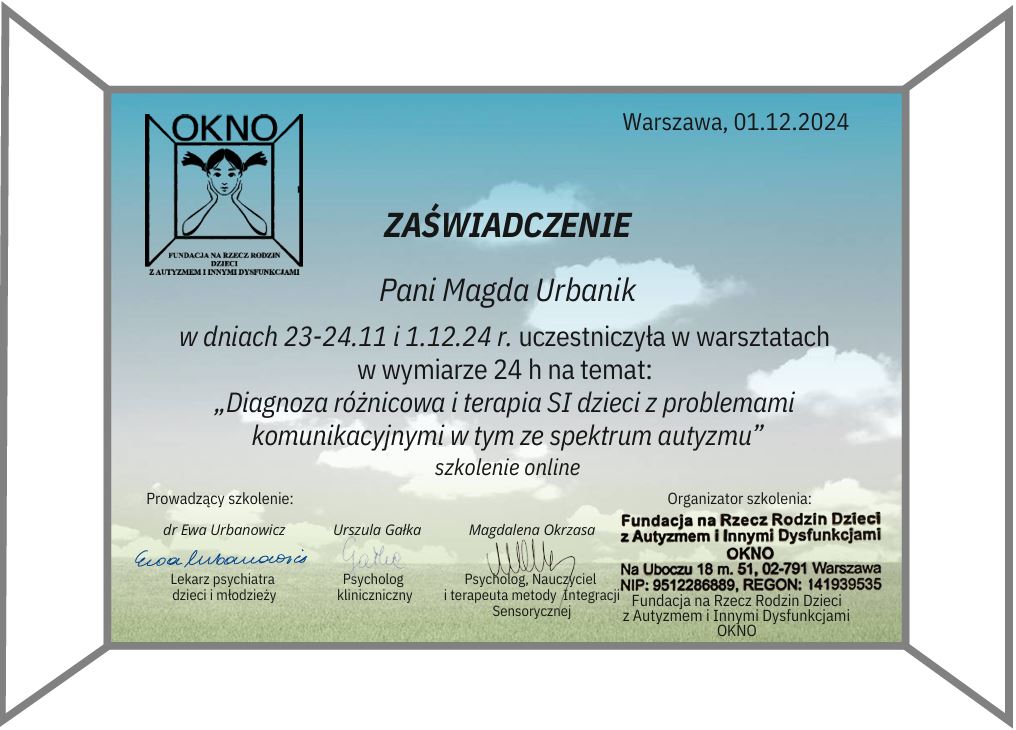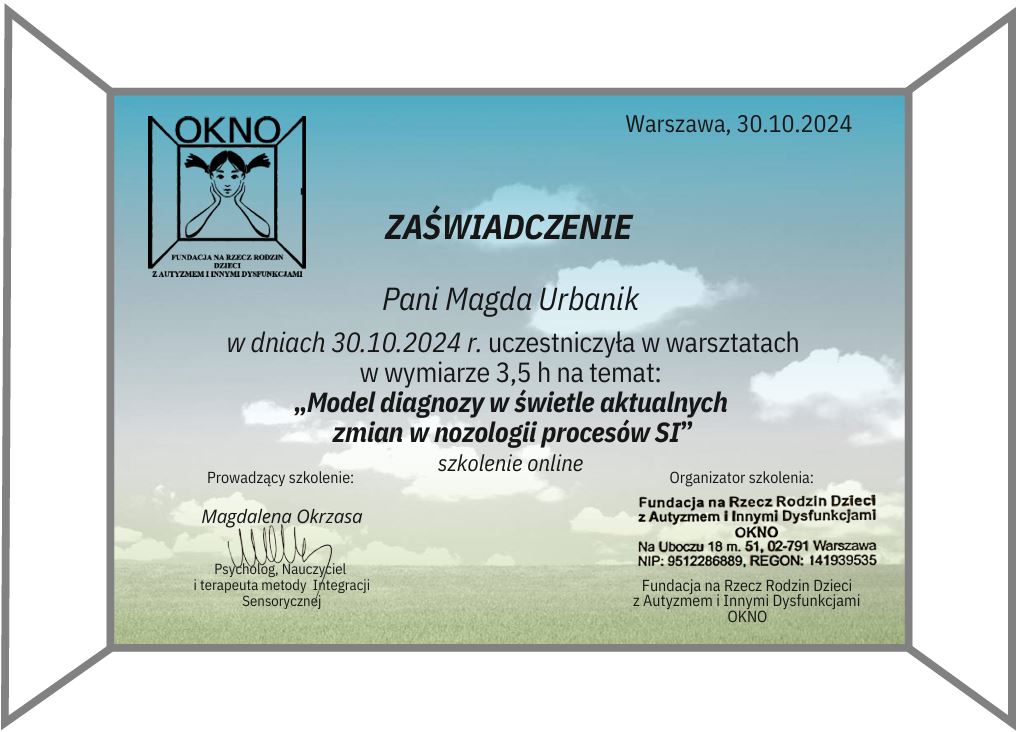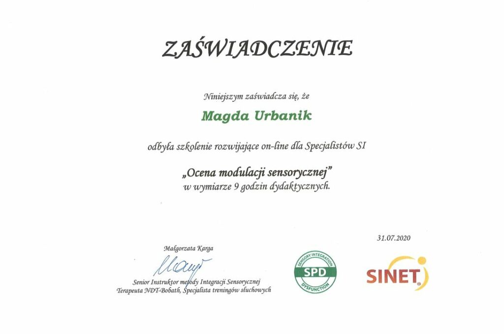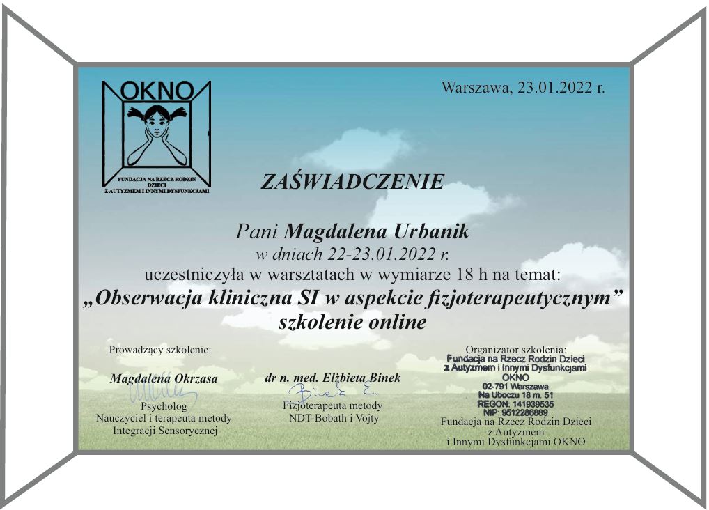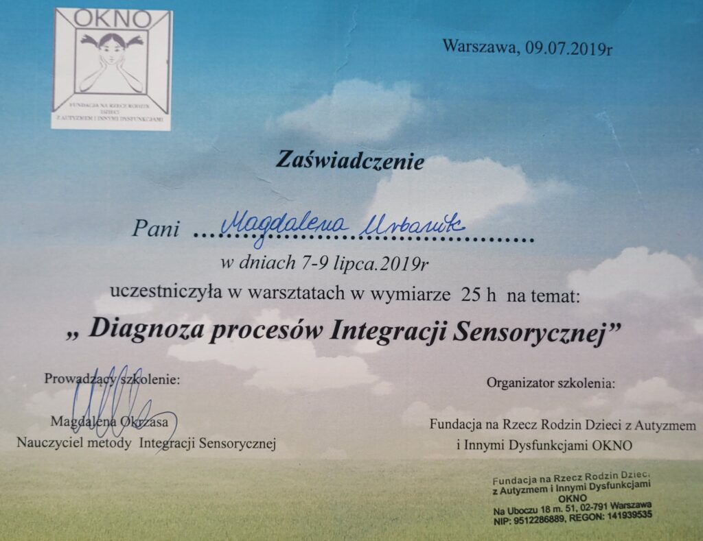 Wiedzę systematycznie uzupełniam o liczne szkolenia, w szczególności organizowane przez Fundację OKNO, PSTIS oraz Acentrum (min. “Ramowy plan terapii dla poszczególnych dysfunkcji procesów SI”, “Diagnoza i terapia małego dziecka oraz dziecka z autyzmem”, “Obserwacja kliniczna SI w aspekcie fizjoterapeutycznym”, “Terapia Ręki PTR”).