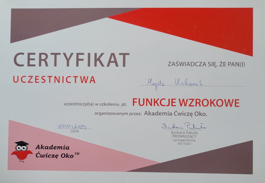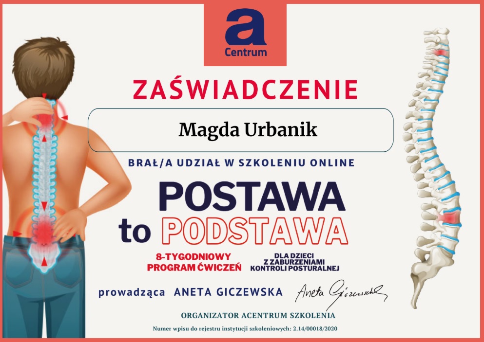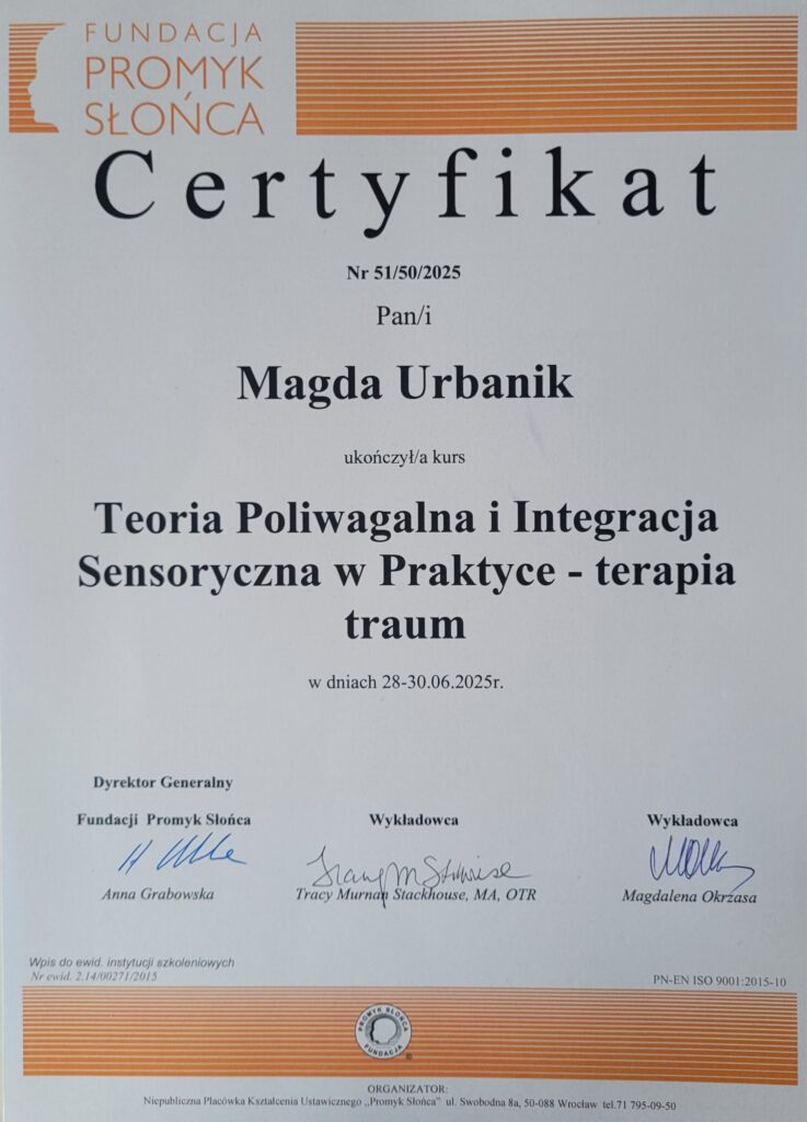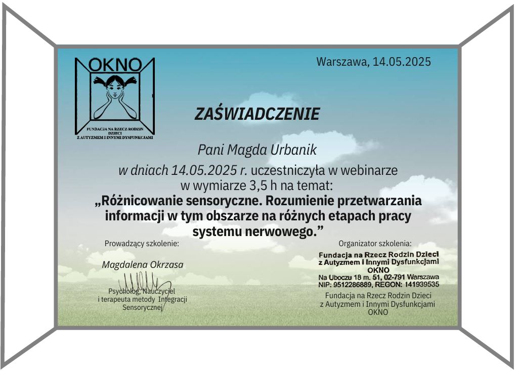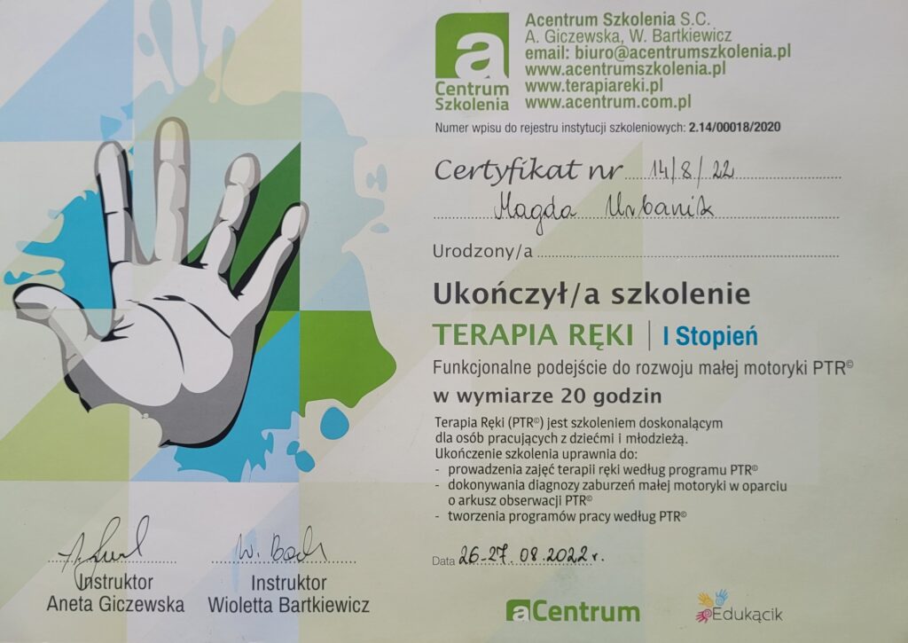 Wiedzę systematycznie uzupełniam o liczne szkolenia, w szczególności organizowane przez Fundację OKNO, PSTIS oraz Acentrum (min. “Ramowy plan terapii dla poszczególnych dysfunkcji procesów SI”, “Diagnoza i terapia małego dziecka oraz dziecka z autyzmem”, “Obserwacja kliniczna SI w aspekcie fizjoterapeutycznym”, “Terapia Ręki PTR”).