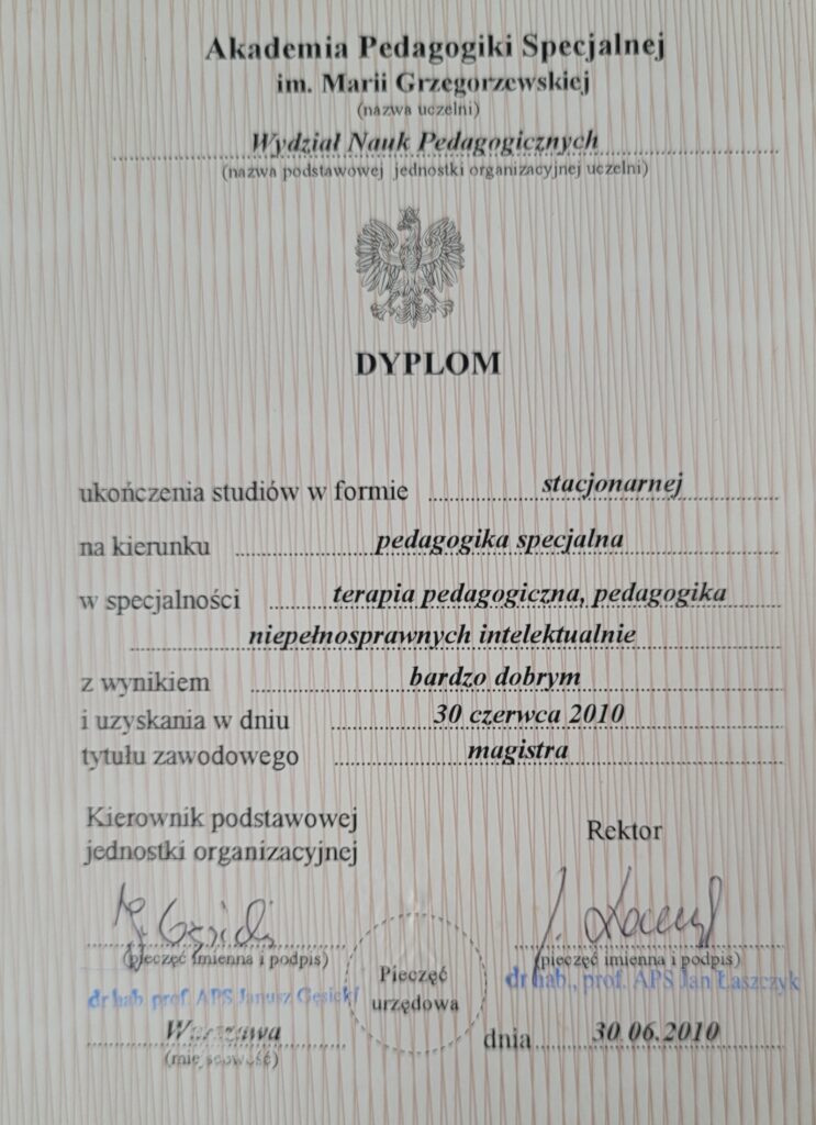 - magisterskie studia na Akademii Pedagogiki Specjalnej w Warszawie (kierunek: pedagogika specjalna, specjalność: terapia pedagogiczna, pedagogika niepełnosprawnych intelektualnie), 2010r.